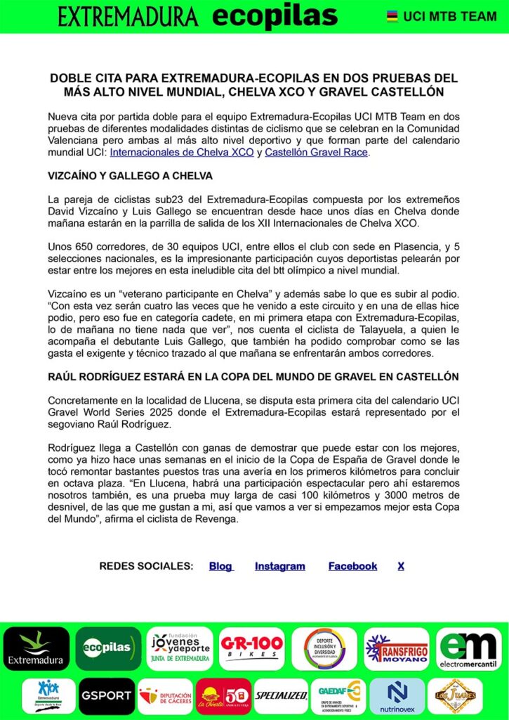 Ayuntamiento de Plasencia | Diputación de Cáceres | Ecopilas | Electromercantil | Fundación Jóvenes y Deporte | GAEDAF | GR-100 Bikes | GSport | La Chinata Pimentón Ahumado | Maria Reyes Murillo | Miel Los Juanes | Nutrinovex | Transfrigo Moyano