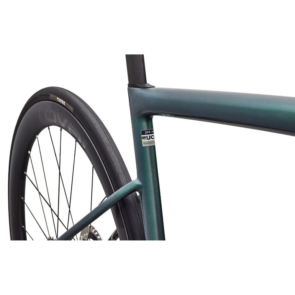 Rueda delantera: Roval Rapide CLX III, carbono, Tubeless Ready, 21 mm internos, 51 mm de perfil, buje Roval LF18-F, 18 radios rectos ARRIS MTO-255 (BioNylon reforzado con carbono, terminales de titanio)