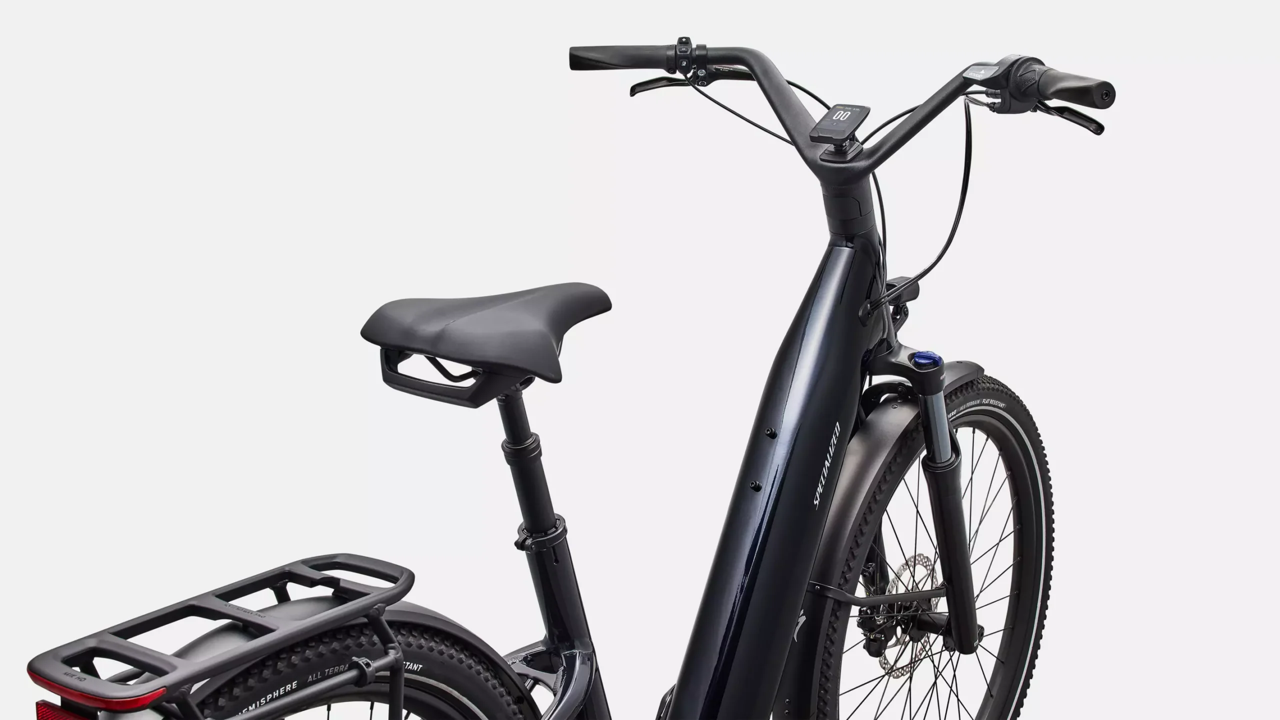 Disfruta de la comodidad en todo momento con una horquilla delantera con suspensión de 80 mm, neumáticos de gran volumen y un poste de asiento con suspensión que suaviza los impactos más duros. - TURBO